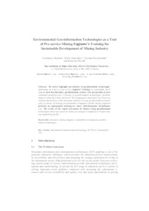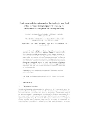 - Morkun, Volodymyr, Semerikov, Serhiy O. (orcid.org/0000-0003-0789-0272), Hryshchenko, Svitlana and Slovak, Kateryna (orcid.org/0000-0003-4012-8386) (2017) Environmental Geo-information Technologies as a Tool of Pre-service Mining Engineer’s Training for Sustainable Development of Mining Industry ICT in Education, Research and Industrial Applications. Integration, Harmonization and Knowledge Transfer 2017 : Proceedings of the 13th International Conference (ICTERI, 2017) (1844). pp. 303-310. ISSN 1613-0073
