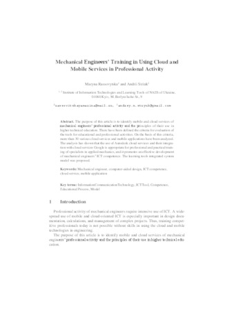 - Rassovytska, M.V. (2017) Mechanical engineers’ training in using cloud and mobile services in professional activity Proceedings of the 13th International Conference on ICT in Education, Research and Industrial Applications. Integration, Harmonization and Knowledge Transfer. (13). pp. 348-359.