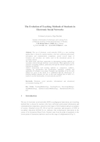 - Lytvynova, S. H. (orcid.org/0000-0002-5450-6635) and Pinchuk, O. P. (orcid.org/0000-0002-2770-0838) (2017) The Evolution of Teaching Methods of Students in Electronic Social Networks Proceedings of the 13th International Conference on ICT in Education, Research and Industrial Applications. Integration, Harmonization and Knowledge Transfer (1844). pp. 360-371. ISSN 1613-0073
