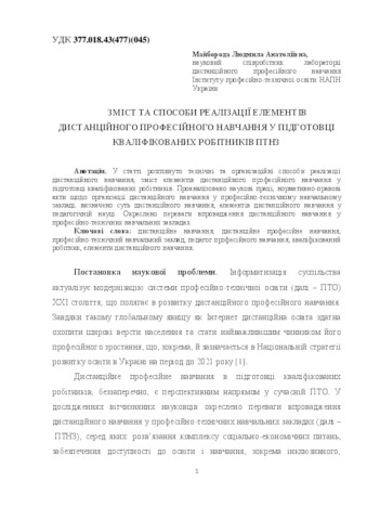 The article examines the technical and organizational ways to implement distance learning, content elements remote vocational training in training skilled workers. Analyzed scientific work regulations regarding distance education in vocational school, learned the essence of distance learning elements of distance learning in teaching science. Outlined the benefits of the introduction of distance learning in vocational schools