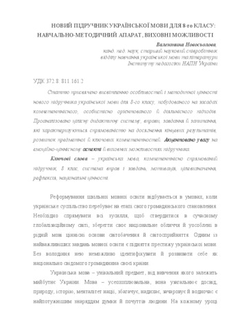 - Новосьолова, Валентина Іванівна (2017) New Ukrainian language textbook for 8th grade: teaching apparatus educational opportunities Українська мова і література в школі, 2 (131). pp. 53-59. ISSN 2076-8184