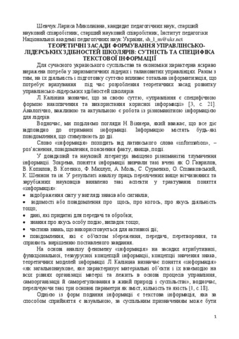 - Шевчук, Л.М. (2017) Theoretical fundamentals of students' management and leadership skills: the nature and the peculiarities of textual information In: Матеріали Всеукраїнської науково-практичної Інтернет-конференції «Ресурсно-орієнтоване навчання в «3D»: доступність, діалог, динаміка» . АКУП ПДАА, м. Полтава, Україна, pp. 163-167.