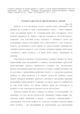 - Біла, І.М. (2012) Preparedness of adults for creative activity with children In: Всеукраїнський науково-методичний семінар, 21 лютого 2012 р., м. Умань, Україна.