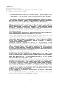 In the article the theoretical and practical principles of self-education of a future specialist in the field of public administration were shown. The essence of I-concept of the individual, through the cognition of the content nature of I-real, I- perfect, I-fantastic and I –dynamic was exposed. The significance of educational assistance in self-education of master students’ personality at higher educational institutions of mentioned type was determined. Pedagogical interaction between an instructor and student was presented in the context of various areas of the process of self-education: intellectual, moral, spiritual, cultural, physical, valeological and professional. The special attention was paid to the integrative nature of the professional sphere of self-education of a specialist in the administrative field. The basic guidelines for further research of the process of self-education of administrative personnel were determined.