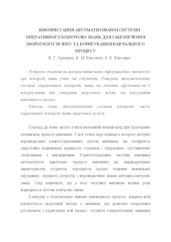 - Гриценко, Валерій Григорович, Власенко, Володимир Миколайович and Власенко, Олександр Володимирович (2008) Using the automated system of operational control knowledge to provide feedback and adjustment of the educational process Вісник Черкаського університету: Педагогічні науки, 139. pp. 41-47. ISSN 2076-586Х