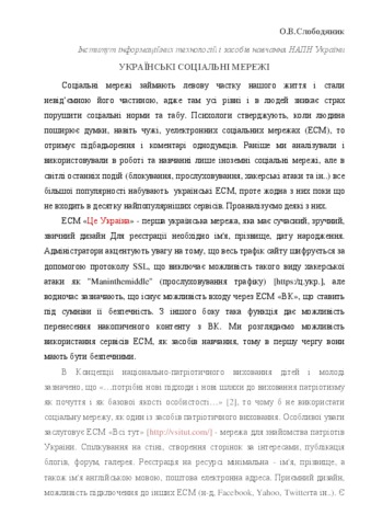 - Слободяник, О.В. (orcid.org/0000-0003-3504-2684) (2017) Ukrainian social networks In: Матеріали Міжнародної ХІІІ (ХХІІІ) науково-практичної конференції "Засоби і технології сучасного навчального середовища" . ПП "Ексклюзив-Систем", м. Кропивницький, Україна, pp. 26-27.