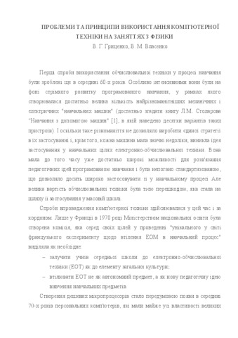 - Гриценко, Валерій Григорович and Власенко, Володимир Миколайович (2001) Problems and principles of computer usage in class of physics Вісник Черкаського університету: Педагогічні науки, 23 (23). pp. 33-36. ISSN 2076-586Х