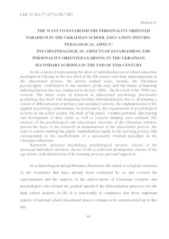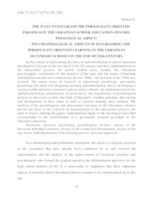 - Dichek, N.P. (2017) The ways to establish the personality oriented paradigm in the Ukrainian school education (psychopedagogical aspect). Psycho-pedagogical aspects of establishing the personality oriented learning in the Ukrainian secondary schools in the end of XXth centur News of Sciense and Education, 1 (49). pp. 49-61. ISSN 2312-2773