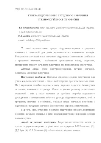 - Туташинський, Василь Іванович and Куліш, Ольга Вікторівна (2017) Genesis textbook on labor training and technology in Ukraine Проблеми сучасного підручника, 1 (18). pp. 225-231. ISSN 2411-1309