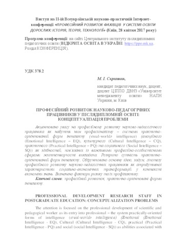 - Скрипник, М.І. (2017) Professional development research staff in postgraduate education: conceptualization problems Професійний розвиток фахівців у системі освіти дорослих: історія, теорія, технології: збірник матеріалів ІІ-ї Всеукраїнської Інтернет-конференції 28 квітня 2017 р. м. Київ. pp. 26-30.