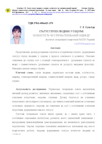 - Кульбіда, С.В. (orcid.org/0000-0002-0194-3495) (2017) Status of the deaf in society: personality or stigmatized individual? Молодь в умовах нової соціальної перспективи (16). pp. 477-488. ISSN 2306-5389