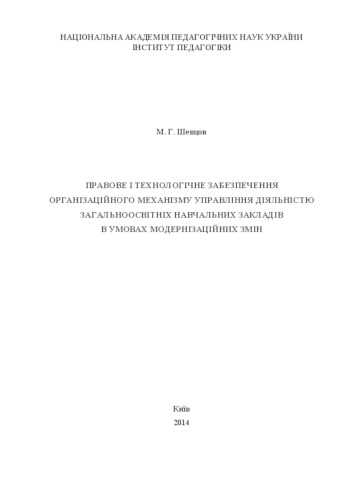 Шевцов, М.Г. (2014) Legal and technological providing of organizational mechanism of management by activity of general educational establishments in the conditions of modernisation changes: manual . Інститут педагогіки НАПН України, м. Київ, Україна. ISBN 978‐966‐644‐434‐2