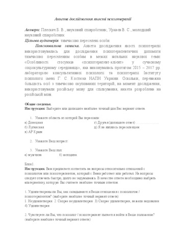 - Плескач, Б.В. (orcid.org/0000-0002-2215-6810) and Уркаєв, В.С. (2017) Questionnaire for the study of the quality of psychotherapy [Teaching Resource] (Unpublished)