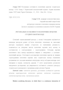 Modern socializing discourse, in which there is a continuous interaction of discourses of various actors of political socialization as semantic vectors of social influence («a struggle» for the designation of reality), affects the formation of meanings of the youth political world outlook as well as peculiarities of its constructing and structuring. The construction of the youth political world outlook carries on due to «the immersion» of youth into a social and political discourse. The need to study political practices, as a factor of structuring the political world outlook of university students, is determined by the understanding that they define the internal logic of youth behavior in a society and a state. The article presents the results of an empirical study focusing on revealing features of the modern discourse of university students in different regions of Ukraine. It has been found out that the major factor of structuring representations underlying student political practices in all the regions is political subjectivity, which has different manifestation. For the students of the center it is actualized in practices of influence and individual responsibility; for the students in the west it is understanding of the foundations of social interaction, civic responsibility and practices of control over the government, which establishes order in the state. Immaturity of the youth subjectivity position in the political interaction causes common practices of rejection and evasion of civic (political) participation in the life of the society. The attitude to oneself as a subject of civic (political) interaction determines the degree of youth participation from active to passive political practices. Passive practices are characterized by the shift of the stress from one’s own activities to those of the authorities (shifting of responsibility, avoidance, helplessness, accusation, etc.).