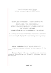 - Мальчевська, О.П. (orcid.org/0000-0002-0268-7876) and Трикоз, С. В. (orcid.org/0000-0002-5929-589X) (2016) Programs for the correction and development work "Geography" (during after-hours) for 6-9 classes of special general educational institutions for children with intellectual disabilities [Teaching Resource]