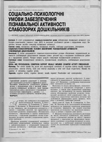 - Костенко, Т.М. (orcid.org/0000-0002-4976-1236) (2012) Social and psychological conditions support visually impaired cognitive activity preschooler Дефектологія. Особлива дитина: навчання і виховання, 3 (63). pp. 27-31. ISSN 2312-2781