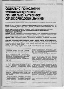 The article reveals the social and psychological conditions of cognitive activity visually impaired preschoolers: external (Family, CCA) and internal (especially a child with visual impairment). Reveals the question of stimulating cognitive activity.