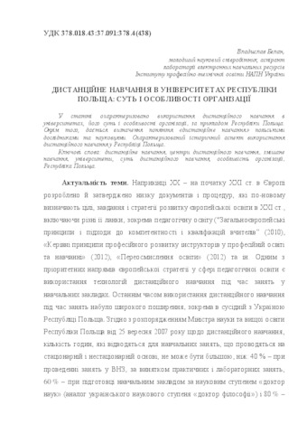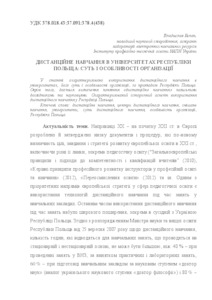 The article characterized the use of distance learning universities, its essence and organization features by example of Republic of Poland. In addition, given the definition of "distance learning" different Polish researchers and scientists. Described the historical aspect of distance learning in Poland.