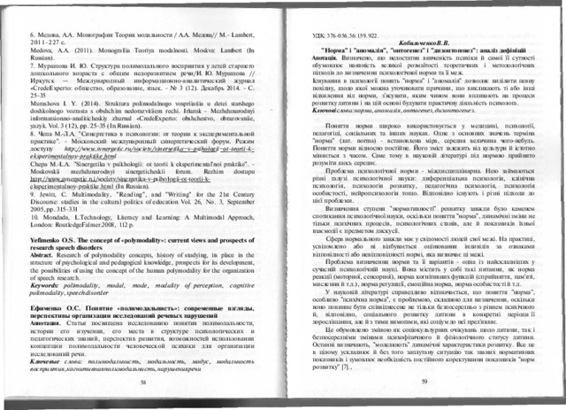 - Кобильченко, В.В. (2015) "Norm" and "anomaly", "ontogenesis" and "dysontogenesis": analysis of definitions Освіта осіб з особливими потребами: шляхи розбудови (8). pp. 59-67. ISSN ISBN 978-966-8977-58-9