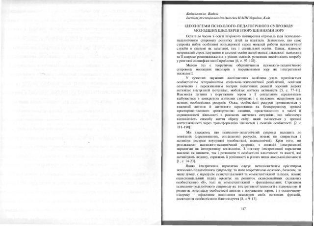 - Кобильченко, В.В. (orcid.org/0000-0002-7717-5090) (2017) Ideologists of psychological and pedagogical accompaniment of junior pupils with visual impairment In: Актуальні проблеми педагогічної освіти: європейський і національний вимір: Матеріали II Міжнародної науково-практичної конференції (16-17 травня 2017 р.) . ФОП Покора І. О., м. Луцьк, Україна, pp. 117-120.