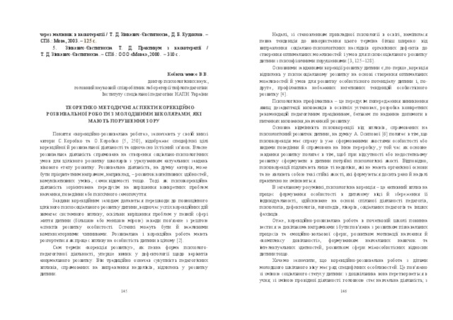 - Кобильченко, В.В. (orcid.org/0000-0002-7717-5090) (2017) Theoretical and methodical aspects of correction and development work with junior schoolchildren with visual impairment In: Спеціальна освіта: стан та перспективи: мат. Всеукр. (заочної) наук.-практ. конф., присв. 5-річчю кафедри корект. освти та спец. психол. (17-18.05.2017) . Харківська гуманітарно–педагогічна академія, м. Харків, Україна, pp. 145-148.