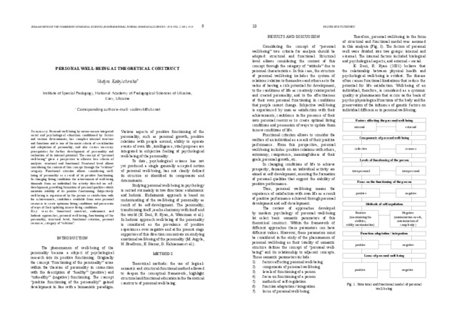 Personal well-being by nature means integrated social and psychological education conditioned by factors and various determinants, has complex internal structure and functions and is one of the main criteria of socialization and adaptation of personality, and also creates necessary prerequisites for further development of personality and realization of its internal potential. The concept of “personal well-being” gives a perspective to allocate two criteria of analysis: structural and functional. Structural level allows considering the content of this concept through the “relation” category. Functional criterion allows considering wellbeing of personality as a result of its positive functioning. In changing living conditions the achievement of well-being demands from an individual the activity directed on selfdevelopment, providing formation of personal qualities which maintain stability of its positive functioning. Subjectively well-being is experienced by the person as satisfaction with the achievements, confi dence available from own personal resources to create optimum living conditions and possession of ways of their updating in new living conditions.