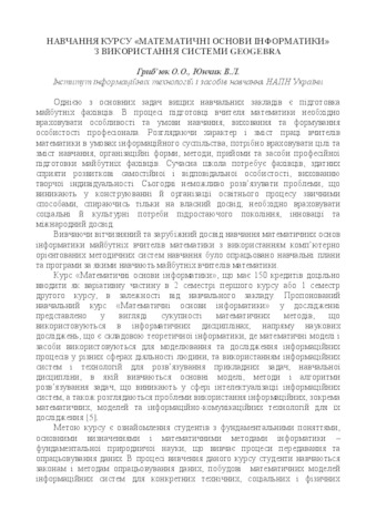 - Гриб'юк, О.О. and Юнчик, В.Л. (2017) Training course "Mathematical foundations of computer science" with the use of the system GeoGebra In: Математика. Інформаційні технології. Освіта. Тези доповідей , 1 (6). Східноєвропейський національний університет імені Лесі Українки, м. Луцьк - с. Світязь, Україна, pp. 90-96.