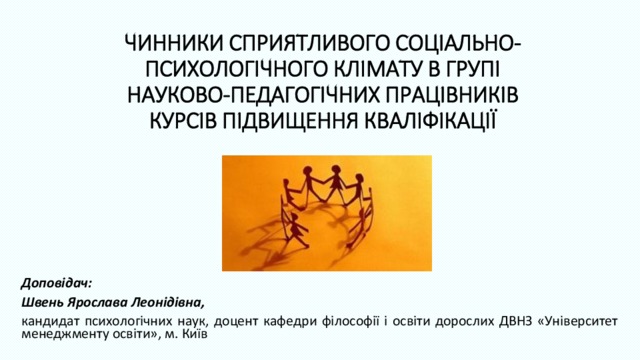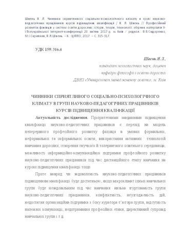 - Швень, Я. Л. (2017) Faktors of favorable social and psychological climate in the group of scientific and pedagogical practices in the training courses Професійний розвиток фахівців у системі освіти дорослих: історія, теорія, технології: збірник матеріалів ІІ-ї Всеукраїнської Інтернет-конференції 28 квітня 2017 р.. pp. 315-317.