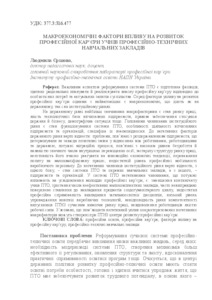 An important aspect of the vocational education system (VET) reform is the specialists training who will be able to rationally plan and implement their own professional career in accordance with personal needs and current society demands. Among the factors of influence on the professional career development the key factor is the macroeconomic factor, which act at both levels: the state and institutional. At the state level the key macroeconomic factors are: labour market condition, quality of domestic enterprise’s technology base, legal support of state and business relations, demographical situation etc. The key factors of the institutional level are condition of VET functioning, the peculiarities of the domestic enterprises activity and organizations, and the specificity of their relations. The negative state-level factors include the following: problems associated with the denationalization of enterprises which determined not always positive changes in the relations between workers, employers and the state; powerful dispersal movements associated with high unemployment level and the presence of a significant number of internally displaced persons; the outdated labour market structure, its inability to respond timely to innovative economic trends; prevalence of demand for low-qualified work; insufficient level of structural mobility of factory personnel. The negative factors of the institutional level are, on the one hand – VET condition and separate educational institution and on the other – enterprises and organizations. The negative factors which powerful influence on awareness of young people's professional careers in VET are: decrease in enrolment in VET; increase in the number of ineffective small institution; often unjustifiably superficial attitude to the subjects teaching of the socio-humanitarian cycle; insufficient professional orientation of general subjects teaching; poor standards of implementation of the newest production technologies; inconsistency of the competence level of vocational schools graduates to modern labour market requirements, employers discontent with the workforce quality. It was found out that created centres of professional career development at vocational schools could mitigate the negative impact of the characterized macro factors.