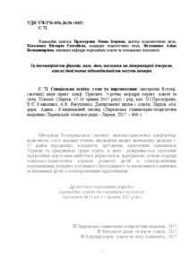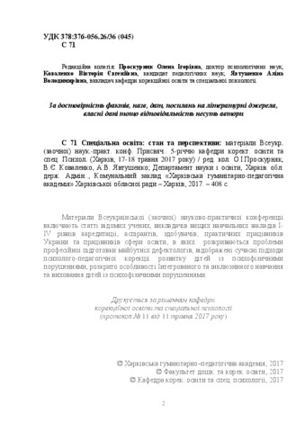 | Additional Information: | Спеціальна освіта: стан та перспективи: матеріали Всеукр. (заочної) наук.-практ. конф. присвяч. 5-річчю кафедри корект. освіти та спец. психол. (Харків, 17-18 травня 2017 року) / ред. кол. О.І.Проскурняк, В.Є. Коваленко, А.В. Явтушенко; Департамент науки і освіти, Харків. обл. держ. Адмін., Комунальний заклад «Харківська гуманітарно-педагогічна академія» Харківської обласної ради – Харків, 2017. – 408 с. Друкується за рішенням кафедри корекційної освіти та спеціальної психології Харківської гуманітарно-педагогічної академії (протокол № 11 від 11 травня 2017 року) |