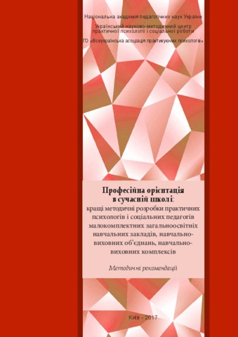 Methodical recommendations "Professional orientation in school: the best methodological development of practical psychologists and social educators of small-scale comprehensive educational institutions, educational and training associations, training and educational complexes" were prepared in compliance with the order of the Ministry of Education of Ukraine of 06.08.13 № 1106 "On approval of the Action Plan of the Ministry of Education And the science of development of the service for the period until 2017 ". The practical importance of the methodological developments presented in the methodological recommendations is to provide the employees of the psychological service of the education system with better methods for preparing students of the modern school for professional self-determination. Methodical recommendations consist of four sections. For teachers, practical psychologists, social educators of general educational, vocational and technical educational institutions, students of these specialties.