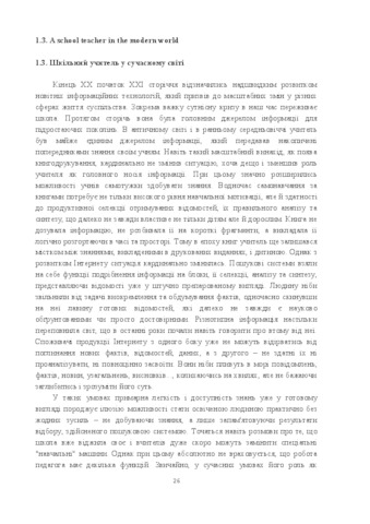 The modern world saturated with information, requires a rethinking the teacher role Traditionally, the teacher was the main source of information for students and that he systematized, processed and passed on accumulated knowledge for children. Now the role of the main supplier of information, facts, opinions, views took over to the Internet. However, information presented by search Engines is not always properly selected, scientifically based and reliable. Therefore, reduced role of the teacher as a mere "translator" of knowledge, but increased its value as a person is able to teach children the ability to compile, analyze, interpret and structure obtained information. Also increased requirements for psychological culture of the teachers, theirs ability to provide harmony and balance for the human interaction