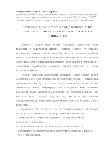 - Кондратенко, Лариса Олександрівна (2017) Features of diagnosing disorders employees of special purpose units Психологічни засади забезпечення службової діяльності працівників правоохоронних органів: матеріали круглого столу , (м. Кривий Ріг, 10 лютого 2017року). pp. 111-114.