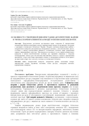 - Коваленко, С. Г. (orcid.org/0000-0002-5836-6422) and Зоріна, Наталія Євгенівна (orcid.org/0000-0001-7627-7805) (2017) Creation and usage of authority files within corporate cooperation between education libraries Інформаційні технології і засоби навчання, 3 (59). pp. 155-167. ISSN 2076-8184