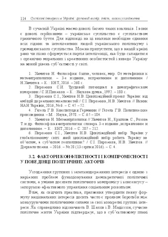 Factors of conflict and compromise in the behavior of political actors are investigated, namely: manifestations of the leader's ambition are analyzed in the context of group and national interests, the dynamics of self-identification of political leaders and the oligarchy is monitored in the context of the problem of preserving the Ukrainian state and the Ukrainian nation, business-political groups are considered as carriers of the foreign policy actors interests. It is alleged that harmonization of group and national interests is the cornerstone of the functioning of a democratic political system, and the ability to achieve political compromise and consensus is a guarantee of effective management of social development.