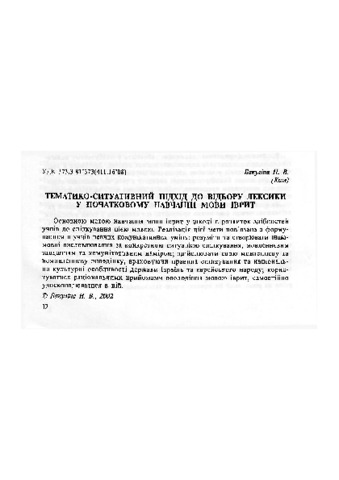 - Бакуліна, Наталія Валеріївна (2002) Thematic-situational approach to the selection of vocabulary in the initial learning of Hebrew. Мова і культура, 5 (5). pp. 12-18.