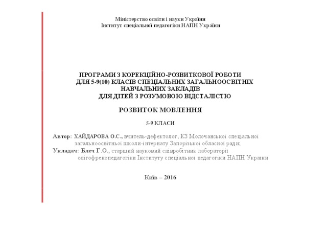 - Хайдарова, О.С. and Блеч, Г. О. (orcid.org/0000-0003-4884-6024) (2016) Programs for correctional and developmental work for 5-9 (10) classes of special general educational institutions for children with mental retardation. Development of speech. Grades 5-9 [Teaching Resource]