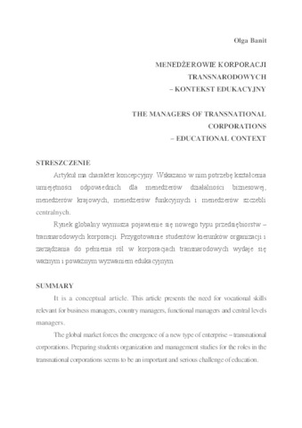 - Banit, Olga (2016) The Managers of Transnational Corporations – Educational Context Zarządzanie i Edukacja (107). pp. 25-39. ISSN 1428-474X