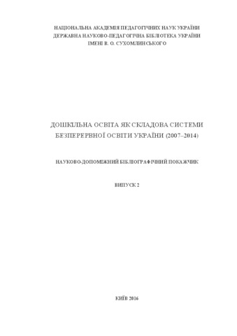 Preschool education as a component a system of continuous education of Ukraine (2007-2014) : scientific and auxiliary bibliographical index. Release 2. (deposited 27 Apr 2017 15:44)