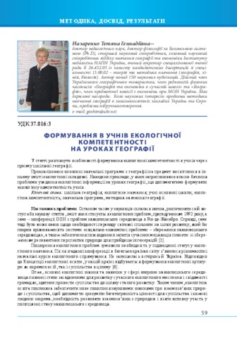 - Назаренко, Тетяна Геннадіївна (orcid.org/0000-0001-7354-5245) (2017) Formation of ecological competence of students in course study geography Український педагогічний журнал, 1. pp. 59-66. ISSN 2411-1317