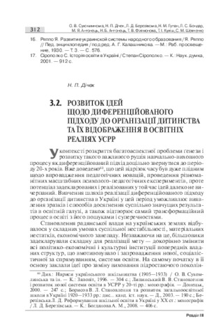 The section reveals the development of a differentiated approach to school education as a complex general pedagogical and general-pedagogical phenomenon of the pedagogical reality of the late nineteenth and first third of the twentieth century. As "expanded the established conceptual-terminological and substantive dimensions of his perception with the coverage of the psychological principles of its realization, and the social determinants and purely pedagogical components (differentiation as a factor and component of the profile of learning, differentiation as a motive for the creation of scientific and methodological support (programs, textbooks, standards Methodological literature, etc.).The section reveals the development of a differentiated approach to school education as a complex general pedagogical and general-pedagogical phenomenon of the pedagogical reality of the late nineteenth and first third of the twentieth century. The established conceptual-terminological and substantive dimensions of his perception with the coverage of the psychological principles of realization, socialization determinants and purely pedagogical components are expanded, ie, differentiation is disclosed as a factor and component of the educational process in school educational institutions of Ukraine through reflection in the content of education, in the profile of education, in scientific- Methodical apparatus, etc.