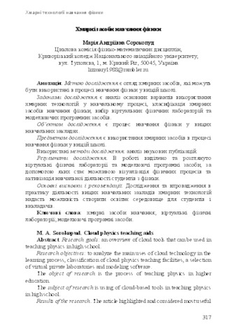 - Сорокопуд, Марія Андріївна (2014) Cloud physics teaching aids New computer technology (12). pp. 317-321. ISSN 2309-1460