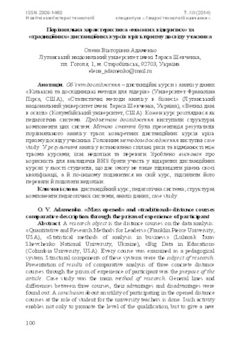 - Адаменко, О.В. (2014) «Mass opened» and «traditional» distance courses comparative description through the prism of experience of participant New computer technology (12). pp. 100-110. ISSN 2309-1460