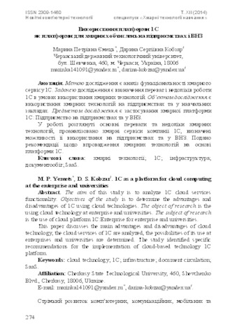 - Ємець, М.П. and Кобзар, Д.С. (2014) 1C as a platform for cloud computing at the enterprise and universities New computer technology (12). pp. 274-277. ISSN 2309-1460