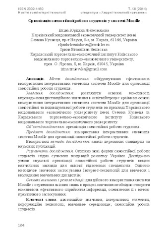 - Железнякова, Е.Ю. and Зміївська, І.В. (2014) Organization of independent work of students in the Moodle system New computer technology (12). pp. 194-203. ISSN 2309-1460
