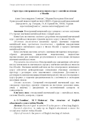 - Томіліна, А.О. and Малоіван, М.В. (2014) The structure of English educational e-course within Moodle New computer technology (12). pp. 225-232. ISSN 2309-1460