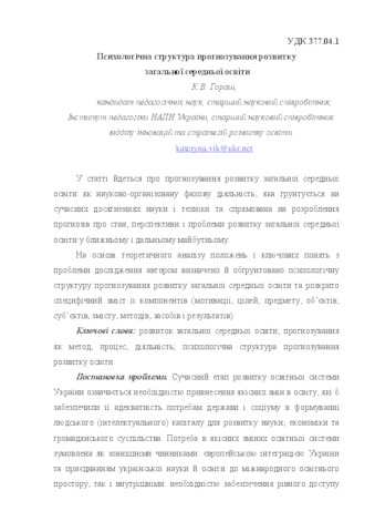 - Гораш, Катерина Вікторівна (2016) Psychological structure of forecasting the development of the comprehensive secondary education Наукове періодичне видання "Український педагогічний журнал", 4 (8). pp. 140-200. ISSN 2411-7420