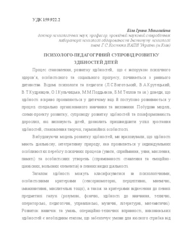 - Біла, І.М. (2017) Psychological and pedagogical support for the development of children's abilities In: Особистість у кризових умовах та критичних ситуаціях життя: психотехнології особистісних змін: Матеріали ІІІ Всеукраїнської науково-практична конференції “” (м. Суми, 16-17 лютого 2017р.) . Вид-во СумДПУ імені А.С. Макаренка, м. Суми, Україна, pp. 10-11. ISBN 978-966-968-236-3