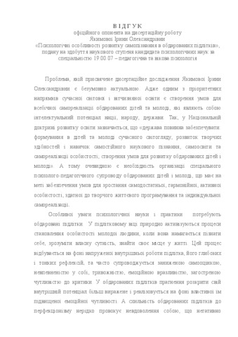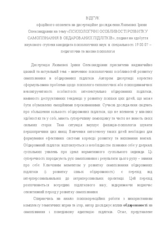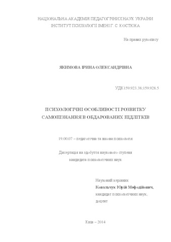 Dissertation for the degree of candidate of psychological sciences, specialty 19.00.07 – pedagogical and age psychology. – Kyiv University named after Borys Grinchenko, Kiev, 2014. The dissertation is devoted to the research of psychological characteristics of gifted adolescents’ self-knowledge development. On the basis of theoretical analysis the model of gifted adolescents’ self-knowledge development is proved. The psychological peculiarities of gifted adolescents’ self-knowledge development are experimentally identified. The levels (biological individual, social individual, personality) and the criteria (orientation, temporal characteristics, cognitive structure, direction of self-knowledge) of gifted adolescents’ self-knowledge development are defined. The program of gifted adolescents’ self-knowledge development is grounded, developed and tested. The effectiveness of the program is proved by the positive dynamics of gifted adolescents’ reflexivity and self-awareness enhance. Based on the results of the research the recommendations for educators, psychologists and students aimed at gifted adolescents’ self-knowledge activation are developed.
