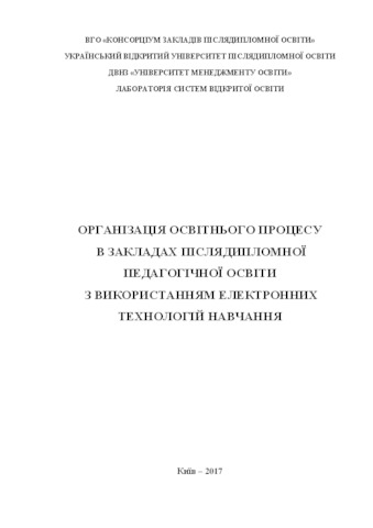This manual is the result of the first stage of the research topic "Theoretical and methodological principles of the application of teaching technologies in the system of open postgraduate education" (registration number 0116U004868). Since the introduction of e-learning technologies in the education system contributes to the improvement of the educational level of educational institutions, it is advisable to pay attention to this issue in courses of continuing education in postgraduate institutions in general, postgraduate pedagogical education in particular. Electronic learning technology is an important supplement to traditional methods of professional development and helps students especially in the phase of self-directed work, which requires the appropriate organization and didactic support For leaders, scientific and pedagogical and pedagogical staff of education institutions of postgraduate education, students of advanced training courses and postgraduate students.